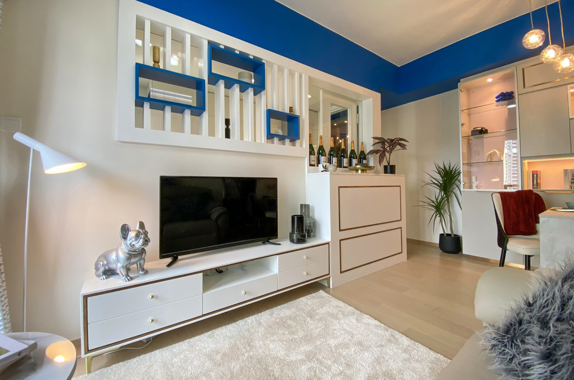 簡約清新的顏色配搭,加上少量金屬元素帶出輕奢華感。通透的廚房間隔大大提高單位空間感,亦能增加廚房的儲物空間。